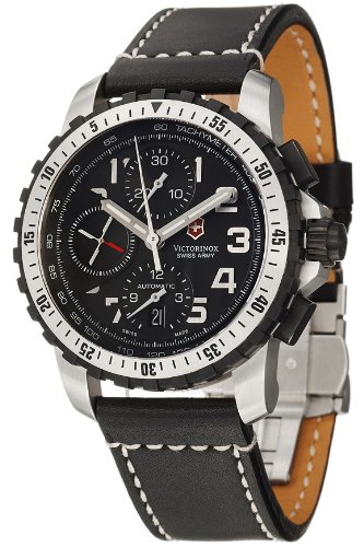 For outdoor enthusiasts who admire a classic-style timepiece, the Victorinox Swiss Army Men's Alpnach Chrono Mechanical Watch offers traditional details with high-performance features. The black leather watchband bracelet has contrast stitching at the edges and a push-button deployment buckle. Featuring a stainless steel case, it also has an exhibition-style, transparent case back so you can see all of the inner mechanics. The bold black dial features a full chrono function with peek-a-boo style Arabic numeral hour indexes and a tachymeter around the outer perimeter. The stainless steel bezel is inscribed with Arabic numeral indexes for the 60-minute diving scale. Ideal for everyday wear, the scratch-resistant sapphire crystal provides ultimate protection against wear and tear. The Victorinox Swiss Army Men's Alpnach Mechanical Chrono Watch is powered by Swiss-made self-winding mechanical movement with a 46-hour power reserve and is water resistant to 330 feet (100 meters)...Read more