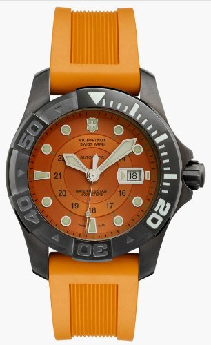 The #V251354 Victorinox Swiss Army Men's Dive Master 500 Mecha Watch is a real attention grabber, thanks to its brilliant orange highlights and the black Ice PVD finish on its stainless steel case and bezel. But don't let its good looks deceive you--this dazzling timepiece is a technical performer, too. Offering a screw-in transparent caseback, a luminous 20-minute indicator on the unidirectional bezel, and a protected screw-down crown, this Dive Master watch is water resistant to 1650 feet. Also featuring a bright orange rubber band with a buckle clasp, this watch showcases an orange dial with luminous hands and indexes, a sweeping second hand, small black Arabic numerals for tracking 24-hour time, and a date window at three o'clock. A scratch-resistant sapphire crystal with an anti-reflective finish protects the watch face and helps ensure easy-reference. This Dive Master 500 watch is powered by Swiss-quartz automatic mechanical movement...Read more