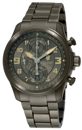 Gunmetal PVD-coated steel case with a gunmetal PVD-coated steellink bracelet. Fixed gunmetal PVD bezel. Black dial with luminous sword-shaped hands and khaki Arabic numeral hour markers. Minute markers. Telemeter scale around the inner bezel. Luminiscent hands and markers. Date display at the 6 o'clock position. Chronograph - three sub-dials displaying: 60 seconds, 30 minutes and 12 hours. Self winding Swiss automatic movement. Scratch resistant sapphire crystal. Gunmetal PVD crown. Skeleton case back. Case diameter: 44 mm. Case thickness: 15 mm. Fold over with safety release clasp. Water resistant at 100 meters / 330 feet. Victorinox Swiss Army Infantry Vintage Gunmetal Chronograph Mens Watch 241460...Read more